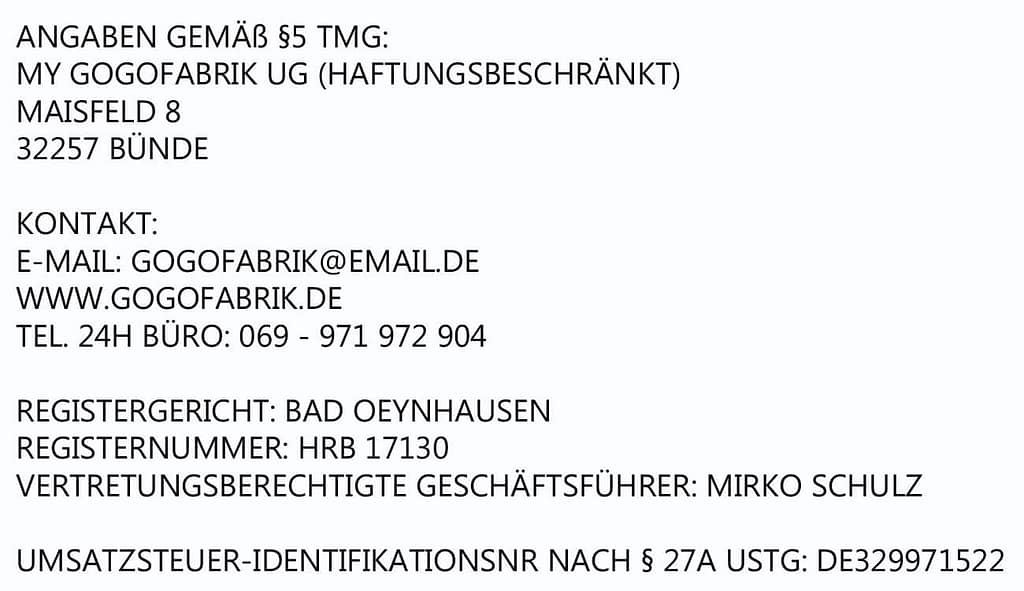 Nach geltendem Recht sind wir verpflichtet, Verbraucher auf die Existenz der Europäischen Online-Streitbeilegungs-Plattform hinzuweisen, die für die Beilegung von Streitigkeiten genutzt werden kann, ohne dass ein Gericht eingeschaltet werden muss. Für die Einrichtung der Plattform ist die Europäische Kommission zuständig. Die Europäische Online-Streitbeilegungs-Plattform ist hier zu finden: http://ec.europa.eu/odr. Unsere E-Mail lautet: gogofabrik@email.de